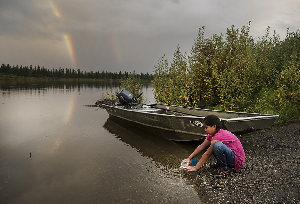 A young girl in the Alaskan village of Shungnak plays in the Kobuk river after a storm.